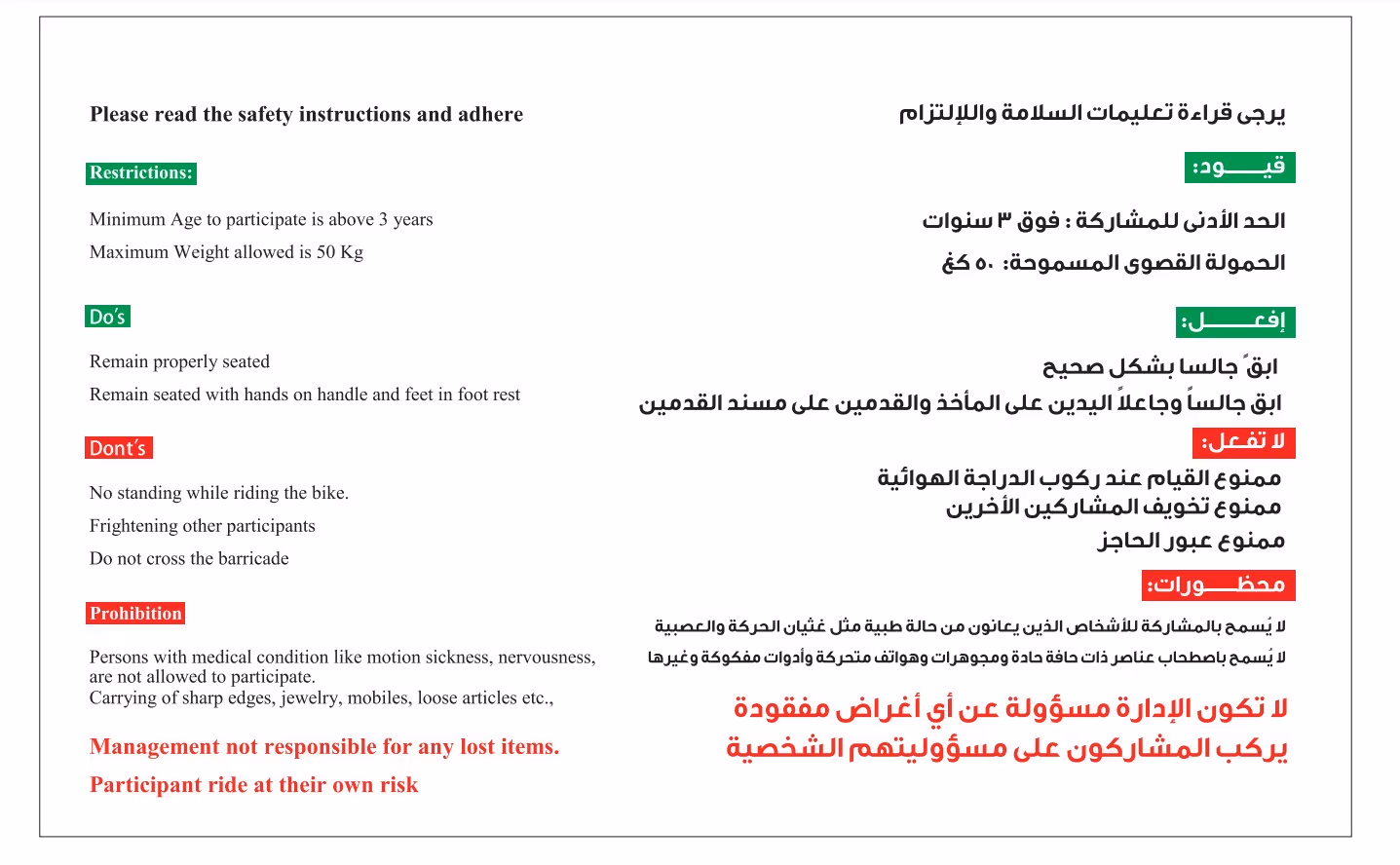 Persons with medical condition like motion sickness, nervousness are not allowed to participate.